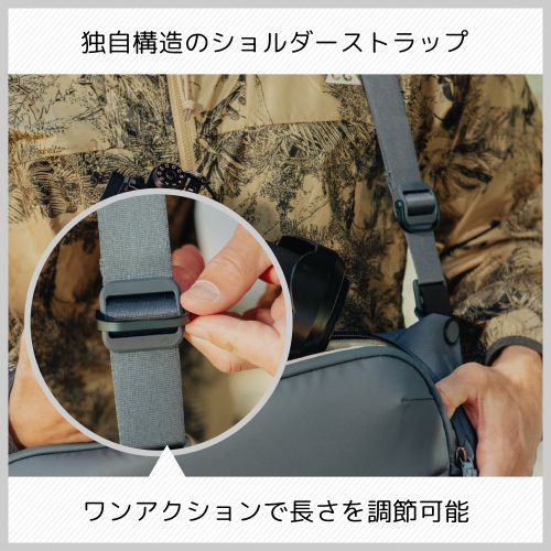 ■独自構造によりワンアクションで長さを調節可能なストラップ、