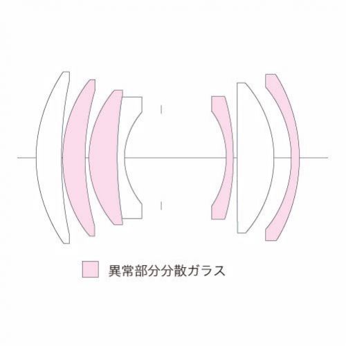新設計の光学系は6群7枚のうち4枚に異常部分分散ガラスを使用。
